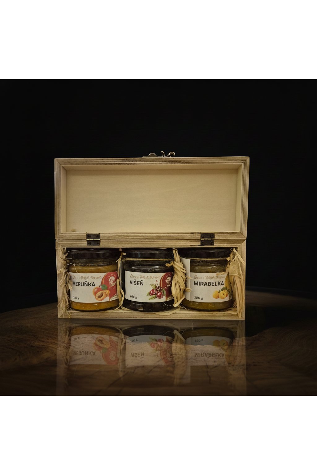 Tato dřevěná dárková krabička ukrývá výběr tří ručně vyráběných džemů z našeho vlastního ekosadu, které vznikají s respektem k přírodě i tradičním postupům. Je ideální volbou pro ty, kteří hledají smysluplný, poctivý a chuťově výrazný dárek.